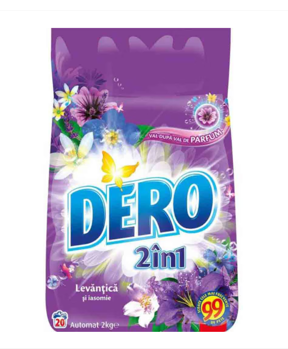 Detergent Automat Pudra cu Parfum de Levantica si Iasomie - Dero 2 in 1 Pudra Concentrata, 1500 g: detergent pudra concentrata pentru masina de spalat automata. Ofera haine curate dupa fiecare utilizare, si poate fi utilizat in cicluri surte si la temperaturi scazute. Lasa un parfum dulce de levantica, combinat cu mirosul imbietor de iasomie. Indeparteaza 99 de pete frecvente, si este eficient pana la 20 de spalari.