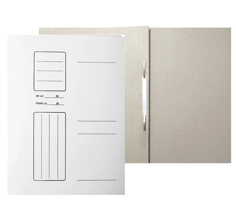 Va propunem un model din carton alb, gramaj 220 g/mp, disponibil la un pret atractiv. Pentru prinderea in interior a documentelor perforate, este prevazut cu sina metalica rezistenta. Coperta este tipizata, pentru a permite completarea informatiilor importante.